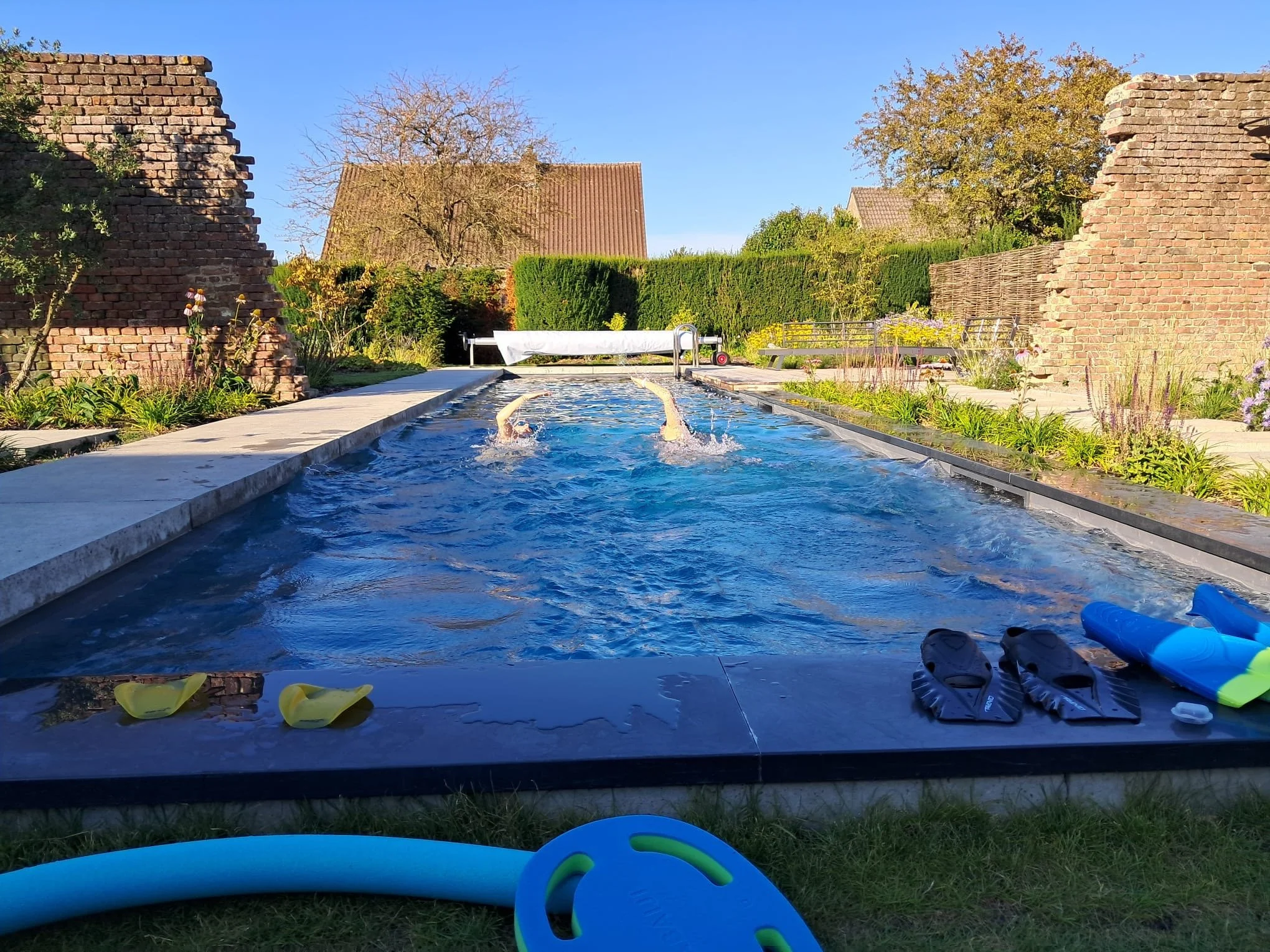 Privé verwarmd bio buitenbad (15m, 1m40 diep) in Ordingen (Sint-Truiden). Biologisch gefilterd, omringd door bloemenpracht – alsof je in open water zwemt, maar met alle comfort.